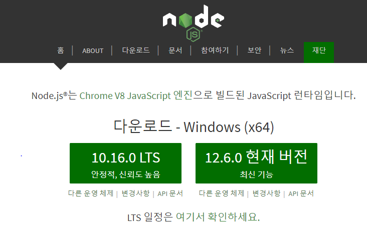 https://nodejs.org/ko/ 사이트에 접속해서 10.15.0 LTS 버전을 다운로드 합니다. (2019년 7월 23일 기준)