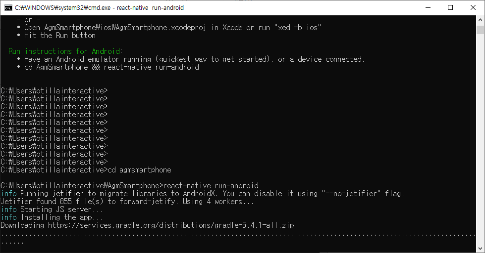이제 이 상태에서 커맨드창에 react-native run-android를 해봅시다.