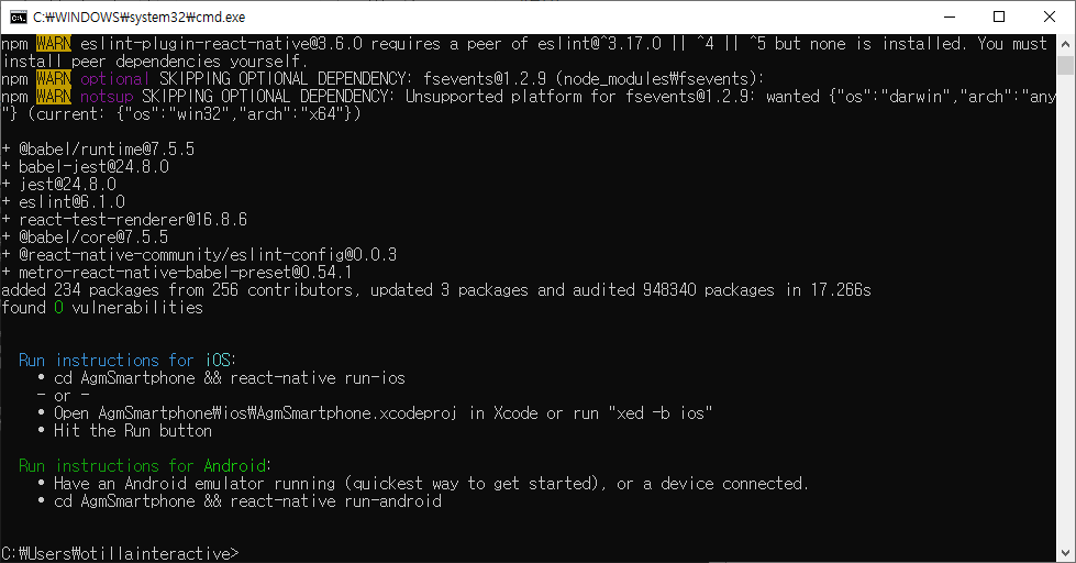 리액트 네이티브를 설치하기 위해 커맨드창에서 명령어를 입력하면
