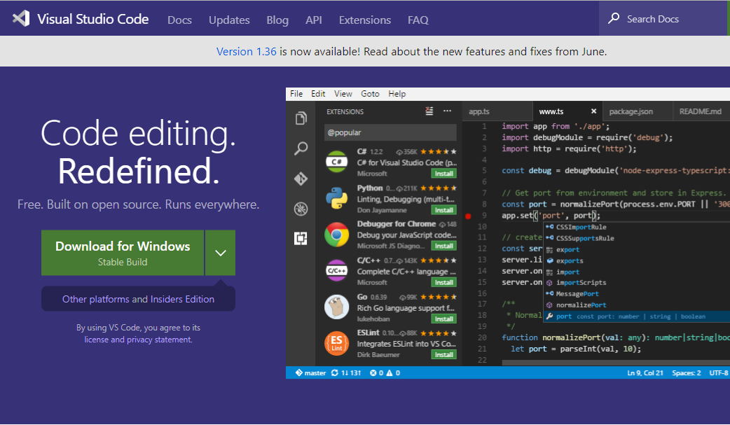 Visual Studio Code is a code editor redefined and optimized for building and debugging modern web and cloud applications. Visual Studio Code is free and available on your favorite platform - Linux, macOS, and Windows.