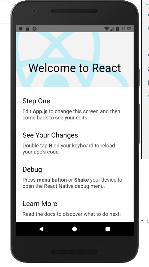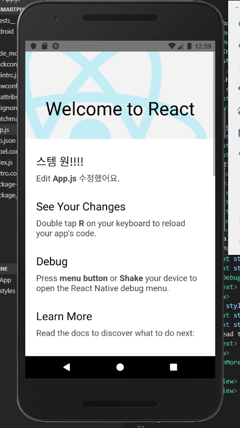 프로젝트상에 App.js파일의 내용을 수정하고, 에뮬레이터에서 R을 두번 눌러주면 바로 바뀐게 적용된다고 하니 여기까지 해보겠습니다.