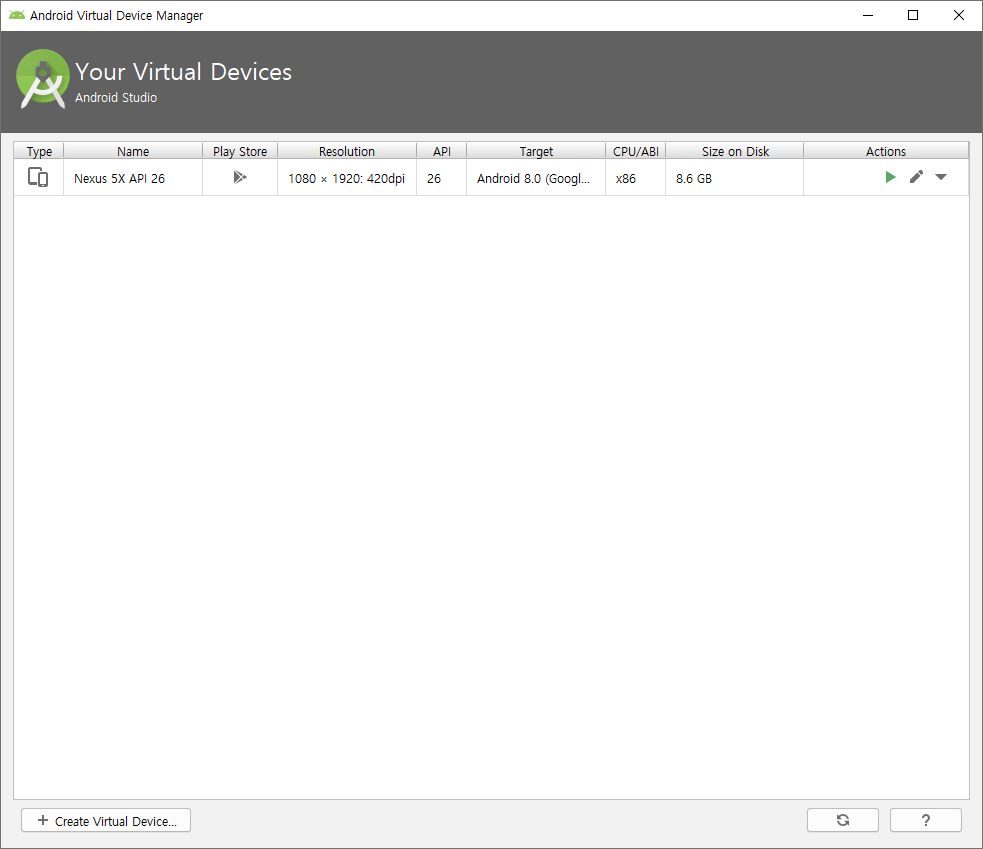 안드로이드 스튜디오를 실행해서 에뮬레이터를 보니, 하나도 없네요 ㅎㅎ