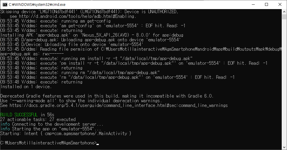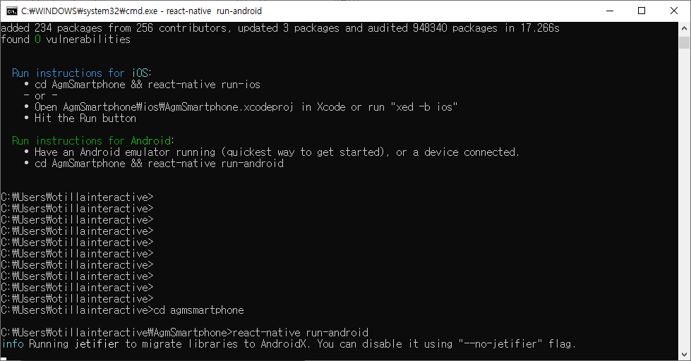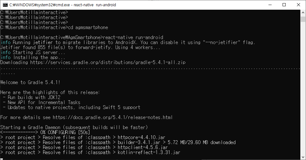 이제 이 상태에서 커맨드창에 react-native run-android를 해봅시다.