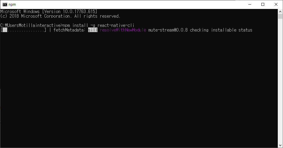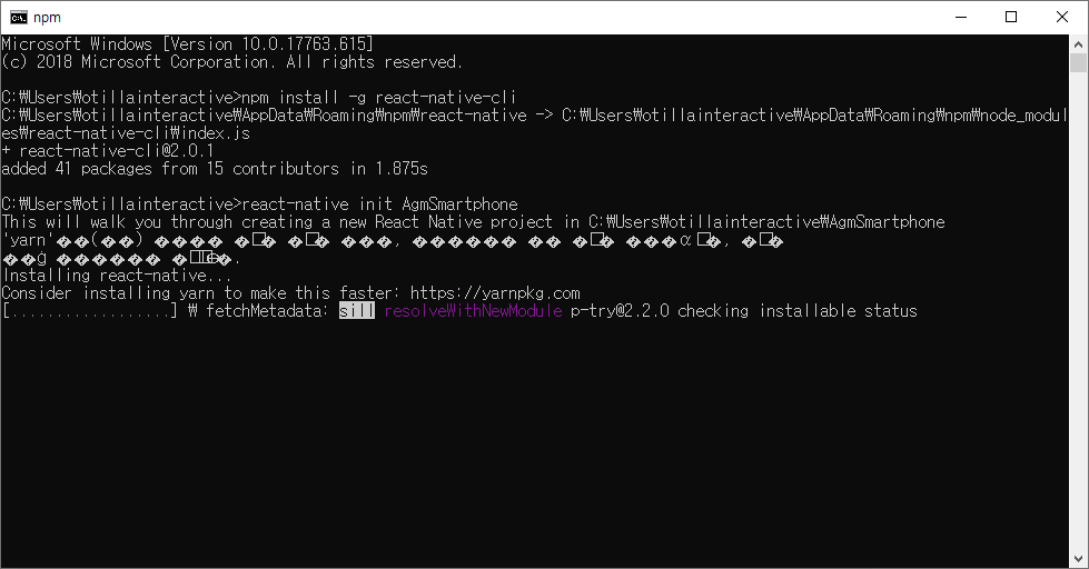 이제 커맨드창에서 npm install -g react-native-cli 라고 입력하고 엔터를 치면 리액트 네이티브 설치를 시작합니다.
