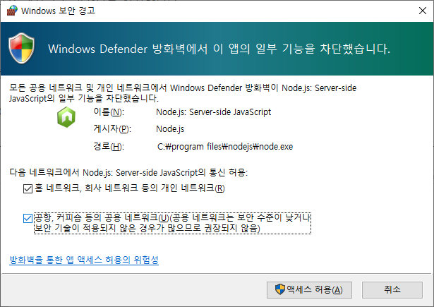 노드 js 가 잘 돌아간다고 따로 창이 하나 떠줍니다.