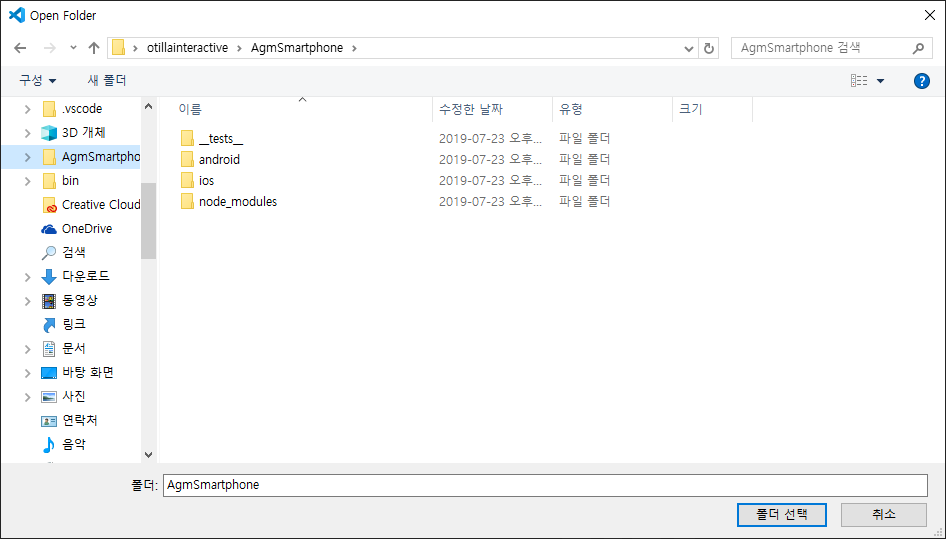 File - open folder에서 아까 만든 프로젝트 폴더를 엽니다.