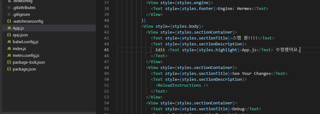 VSCode에서 App.js파일을 열어 아래와 같이 수정했습니다.