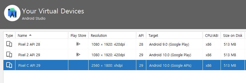 버전을 새로 다운받아 총 3개의 에뮬레이터를 생성했습니다.