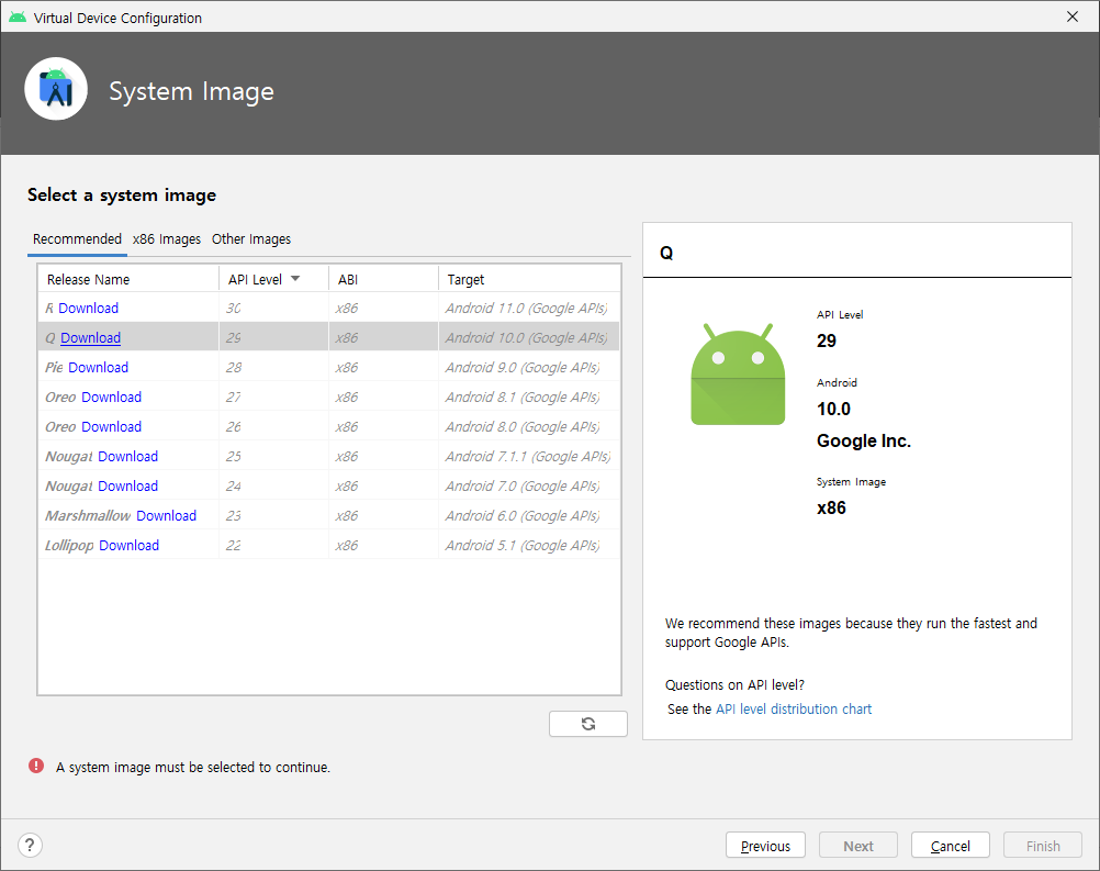 업데이트를 하면 android 10.0 버전 즉, api 29 레벨의 에뮬레이터가