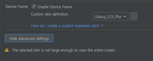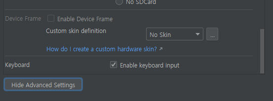 에뮬레이터를 신규로 생성하든, 수정을 하든 스킨설정이 있는 화면으로 진입합니다.