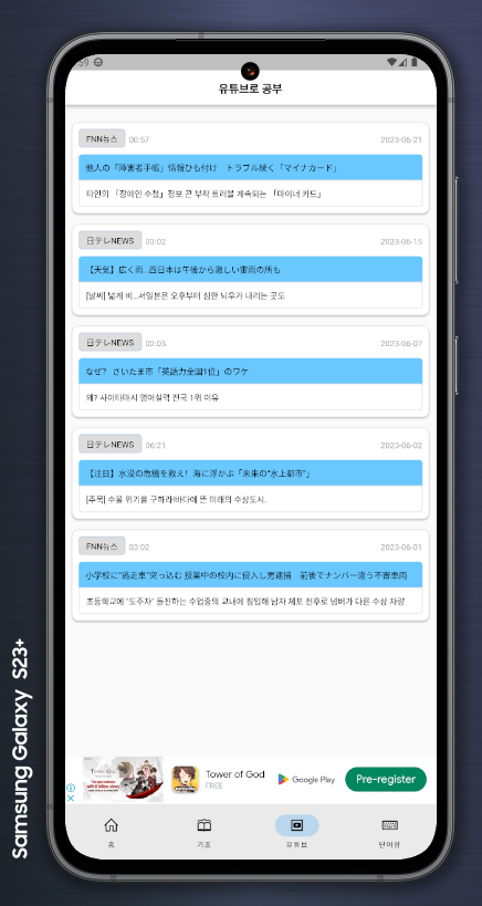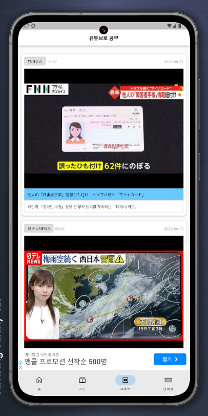 생활일본어 앱에서 유튜브 강좌 리스트 화면이 기존에는 이러했습니다.